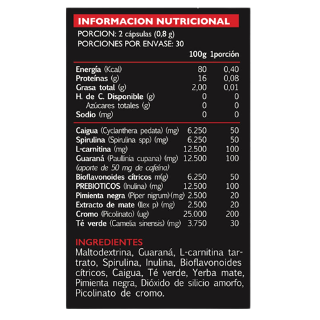 Formulado para combatir el sobrepeso. Contiene caigua, spirulina, L-carnitina,